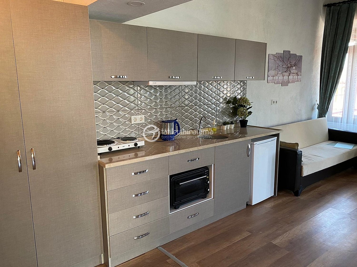 Mutfak donanımlıdır.mini fırın,buzdolabı,mutfak gereçleri,elektrikli ocak mevcuttur.